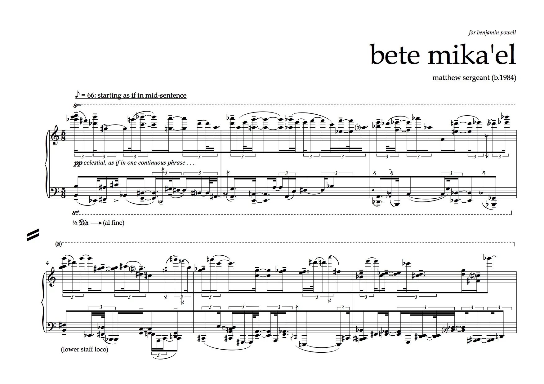 The piano piece is constructed from a group of materials, labelled as ‘archetypal forms’ in my musical sketches. Each ‘archetypal form’ could be described as material stereotypes, including contrapuntal forms, chorale-like forms and melodic forms amongst others. This group of materials are arbitrarily superimposed- or perhaps collided is a better word here - in different combinations, often entangling together into a confused mass of highly dense music. Sometimes particular forms rise to the surface and become clarified, whilst others are mutilated and distorted by that which is layered upon them